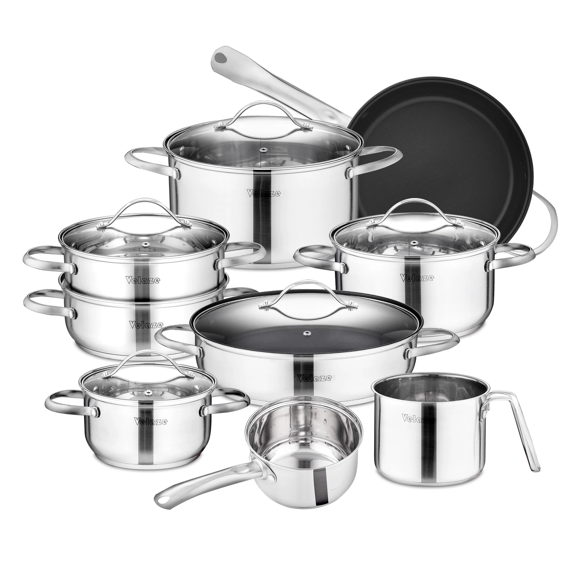 Velaze, Miki, 8/9/14 Pieces – Set of Pots and Pans, Cookware Battery Chef Casserole in Stainless Steel Chrome Suitable for Induction Plates, Glass Lid, Silver